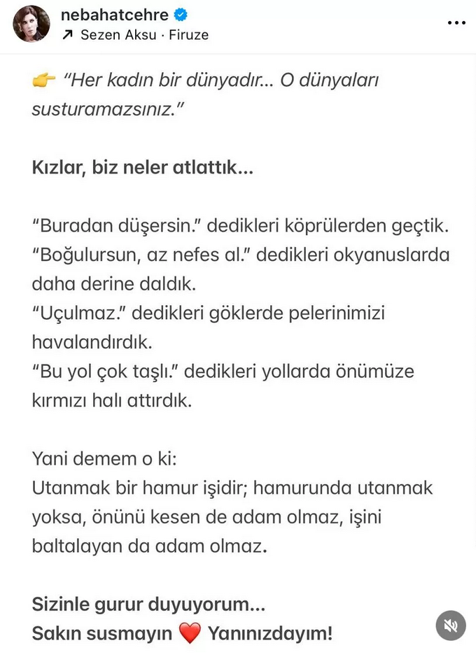 Usta oyuncu Nebahat Çehre, sosyal medya hesabından yaptığı paylaşımda kadınlara seslenerek “Sizinle gurur duyuyorum, sakın susmayın” dedi. Çehre’nin Sezen Aksu’nun Firuze şarkısından alıntı yaparak başladığı mesajı kısa sürede büyük destek gördü.